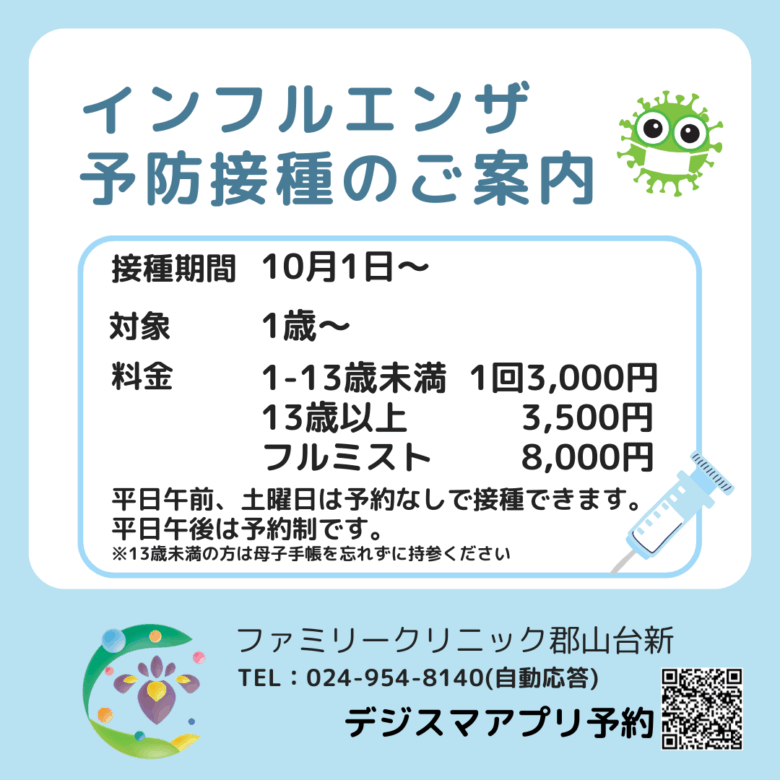 ファミリークリニック郡山台新のホームページにアクセスいただき、誠にありがとうございます。